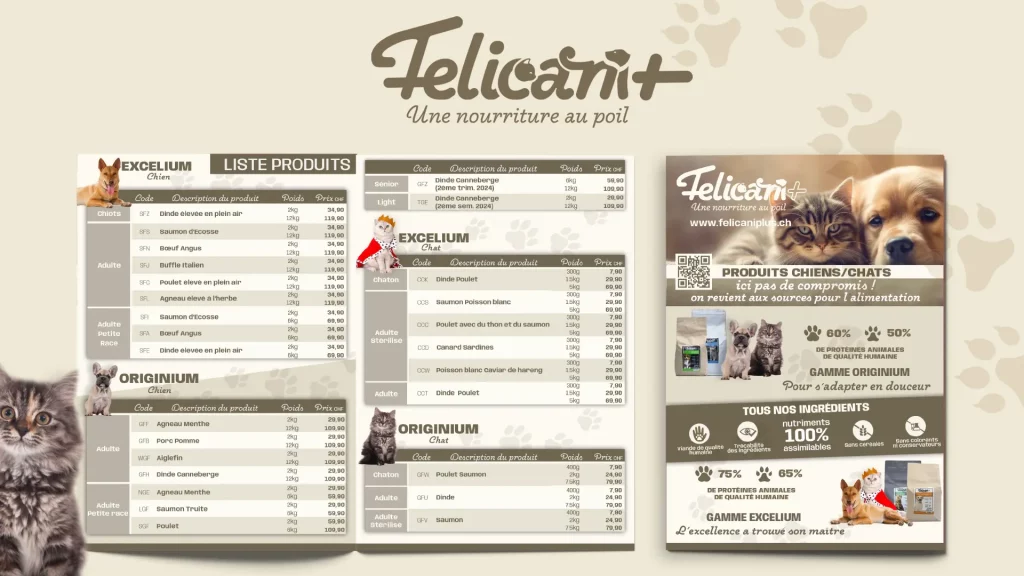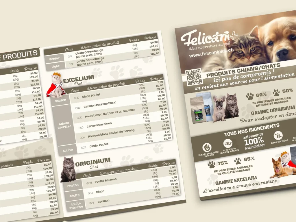 Pour faire connaitre les prix en magasin, ce dépliant au format A5  à été penser pour aller  l’essentiel tout en rappelant les valeurs de la marque Felicani+.(Il sera également distribuer aux clients via les colis et par e-mail.)